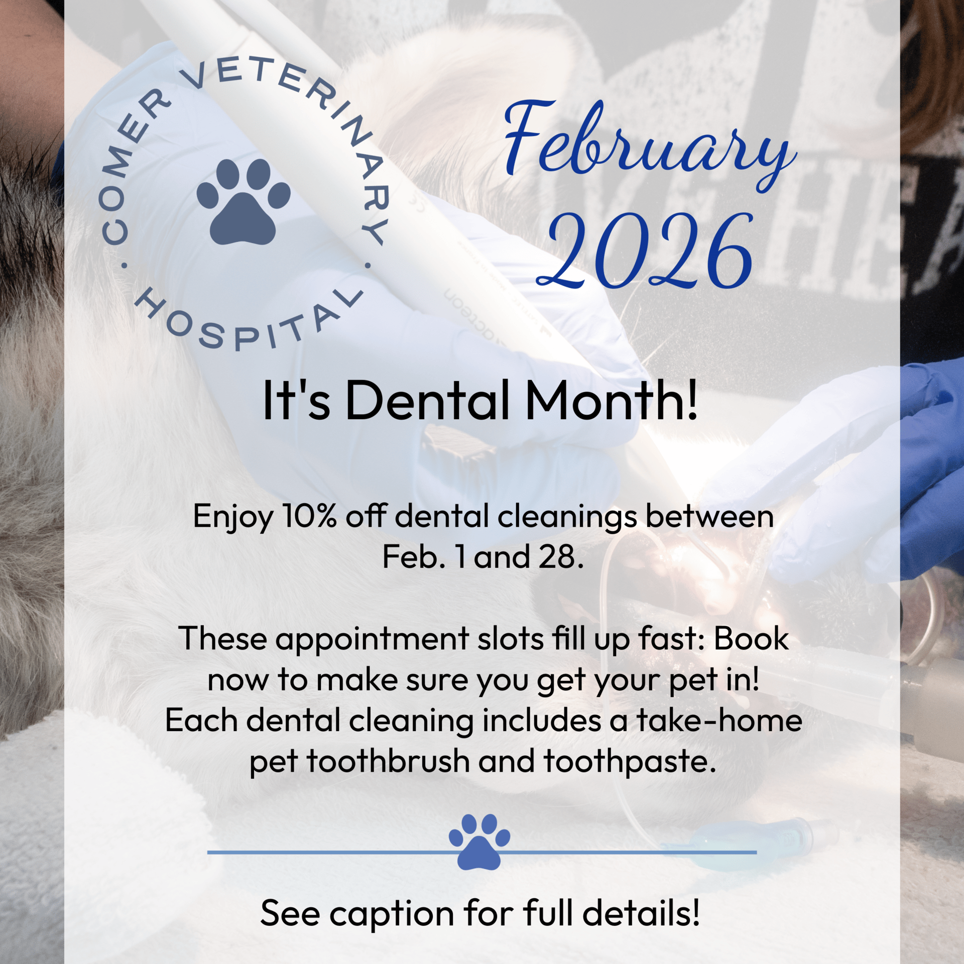 Our annual savings on dental care return from Feb. 1 through 28. All month long, you’ll save 10% on DENTAL CLEANINGS! Despite increasing our dental appointment slots in February, y’all book us up each year, and we anticipate 2026 being no exception. We recommend going ahead and calling us NOW to schedule your pet’s dental cleaning! Each cleaning includes a thorough oral exam, dental scaling, tooth polishing, and take-home goodies of a toothbrush and toothpaste.