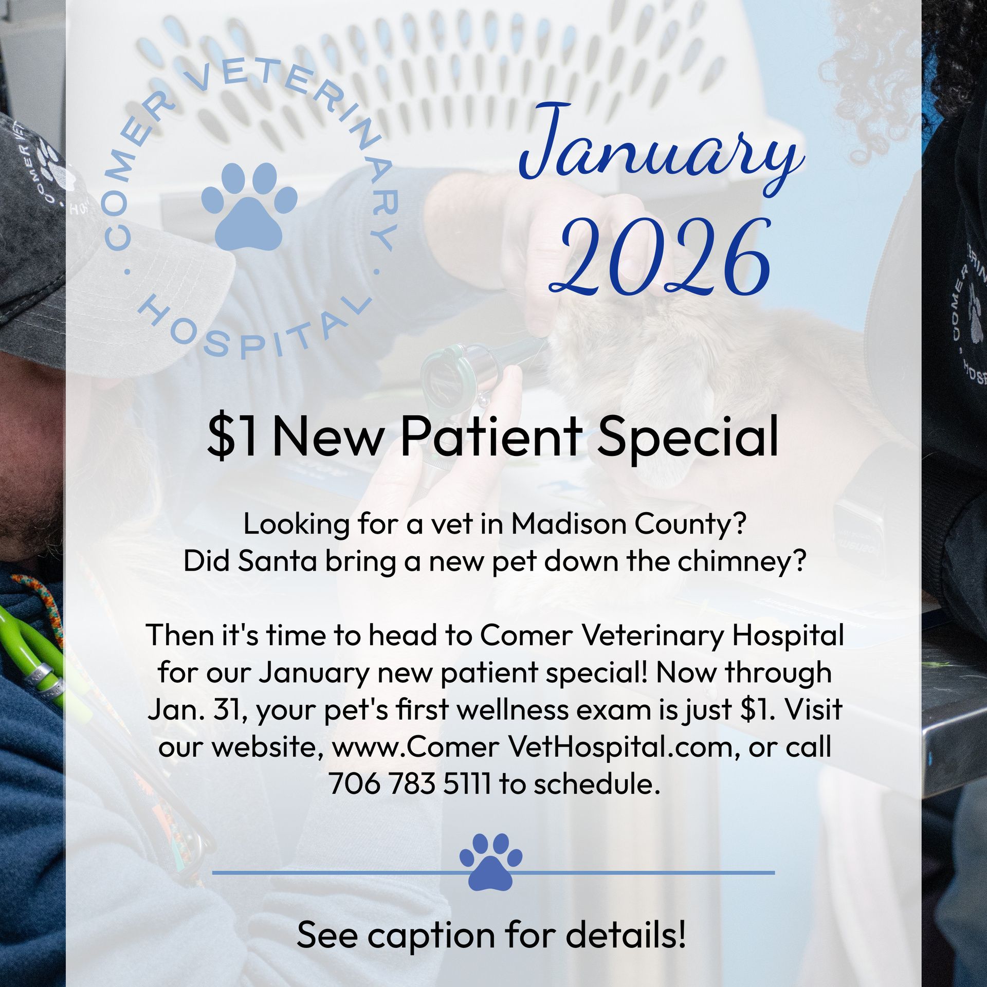 Sounds like it’s time to head to Comer Veterinary Hospital for our January new patient special! Through Jan. 31, your pet’s first wellness exam is just $1.
