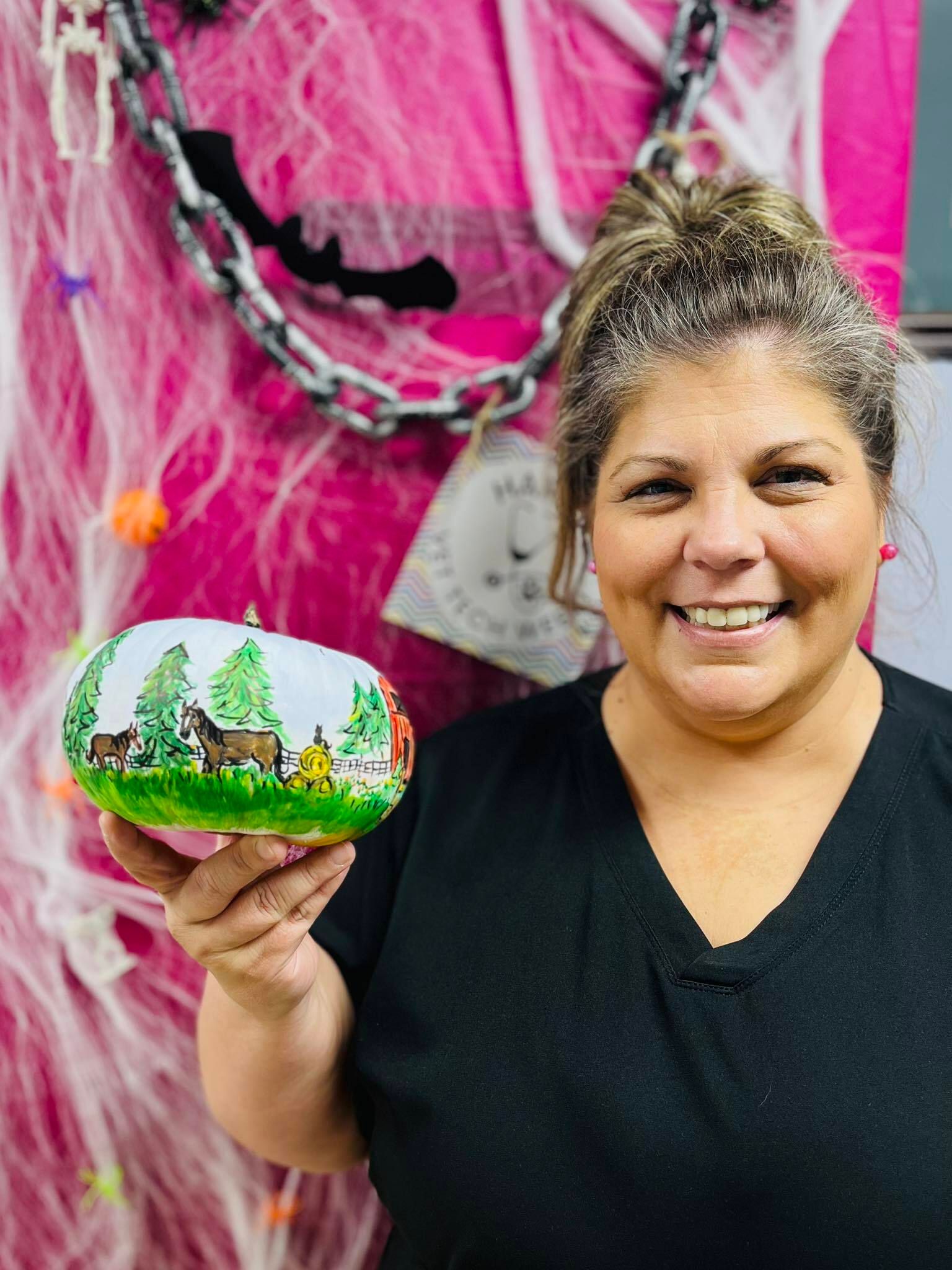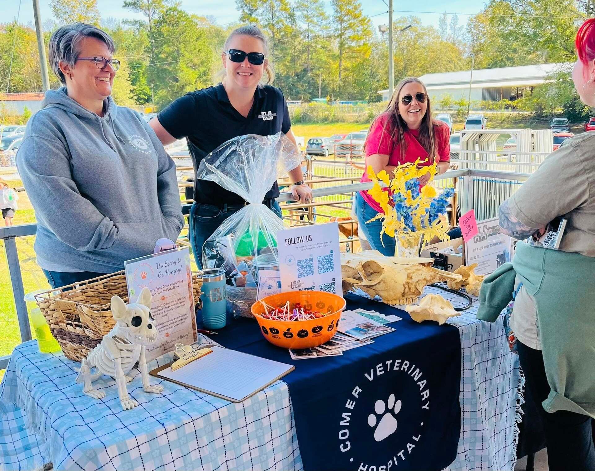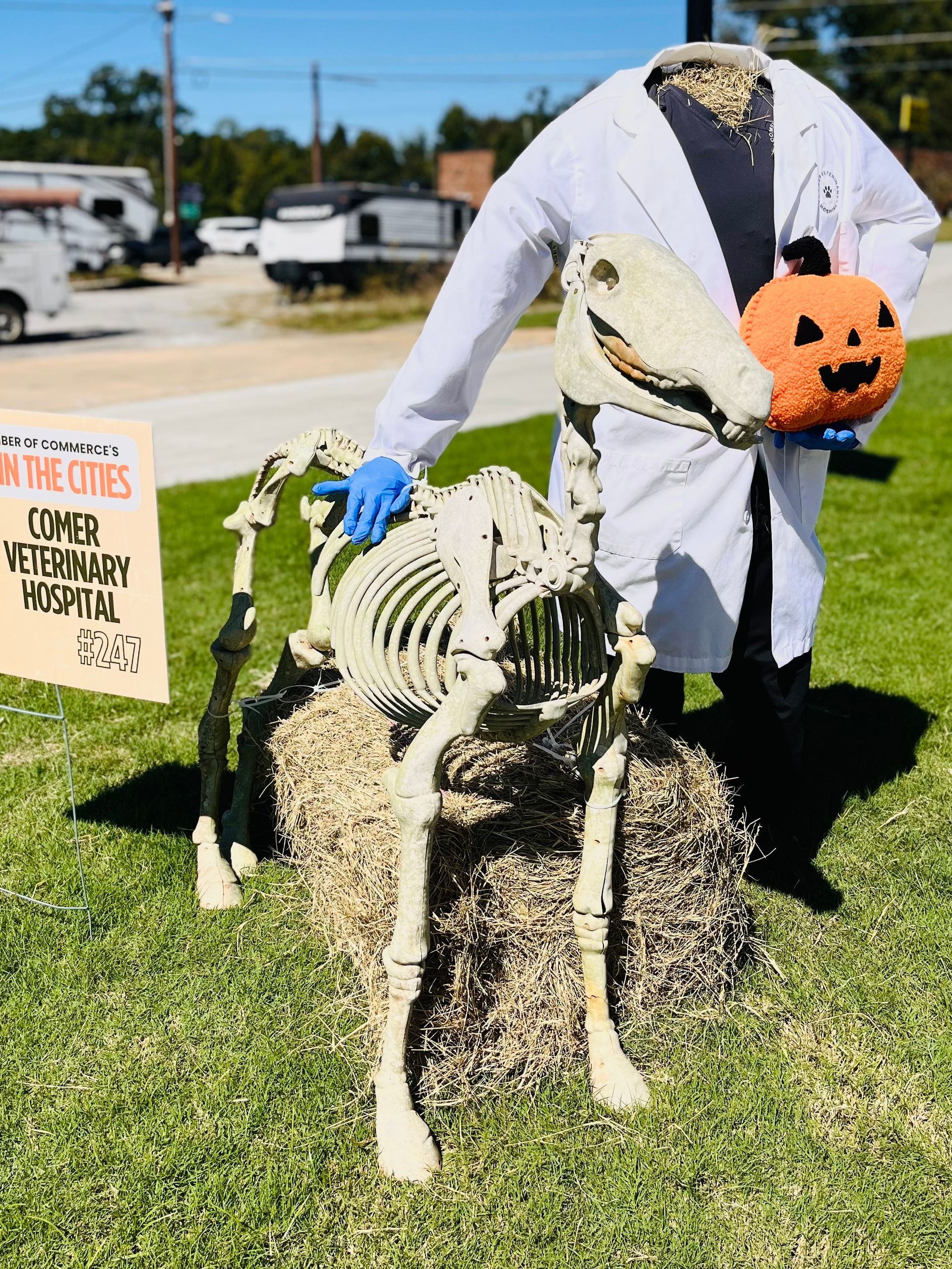 ![]() Meet the Headless Horse Vet! Each year, Comer Vet participates in the Madison County "Scarecrows in the Cities” competition. Dr. Russell came up with our 2025 contribution! | ![]() Receptionist Erica was the winner of our staff pumpkin painting contest! Our Facebook and Instagram followers fell in love with her detailed horse farm and barn scene. | ![]() The month wound down with Harvest Festival at the Madison County Fairgrounds. Comer Vet teamed up with our sister clinic, Custom Livestock Solutions, with a booth where we had veterinary information, merch, and livestock meet-and-greets! |