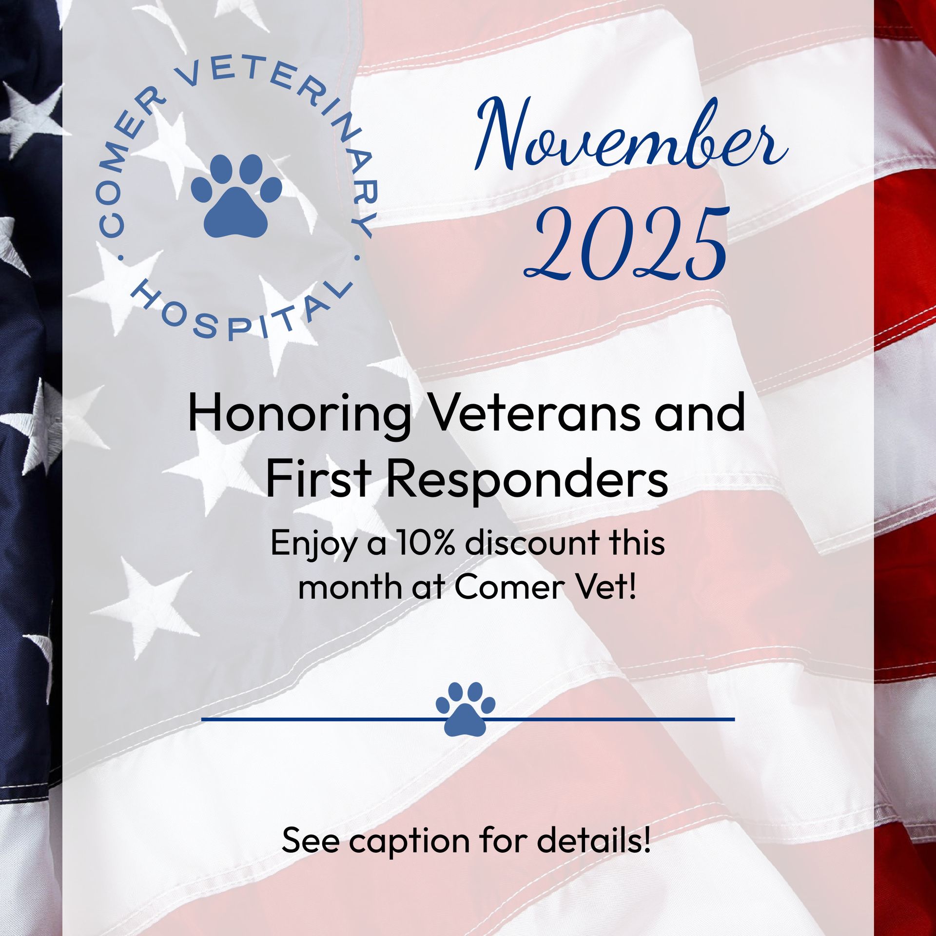 As a small token of our appreciation, the Comer Vet team offers a 10 percent discount to all veterans and first responders this month. Please present your military ID or service badge during your appointment so we can apply your discount!
